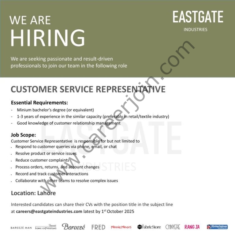 Interested candidates can share their CVs with the position title in the subject line at careers@eastgateindustries.com latest by 1st October 2025