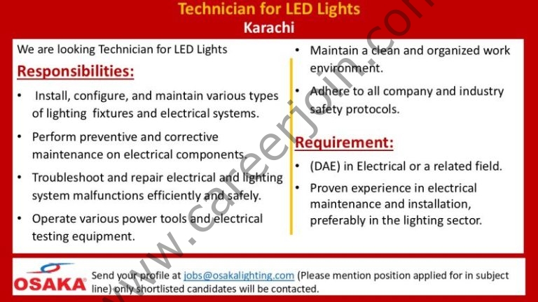 Kindly send us your cv at jobs@osakalighting.com with subject Technician only shortlisted candidates will be contacted.