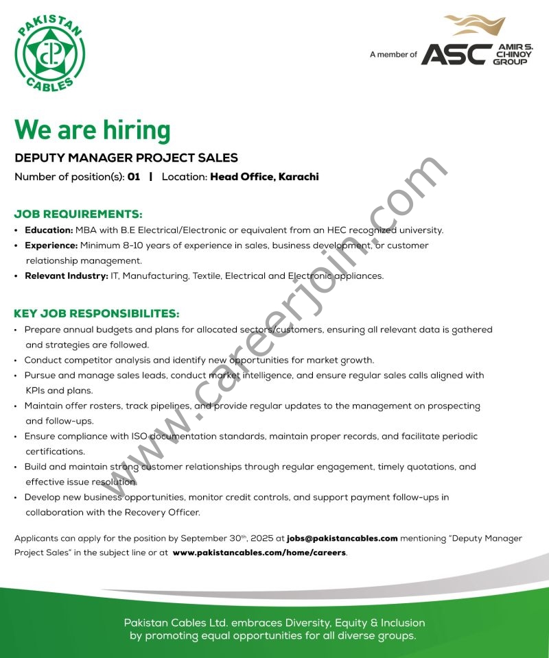 Email your resumes to jobs@pakistancables.com by September 30th, 2025, mentioning “Deputy Manager Project Sales” in the subject line.